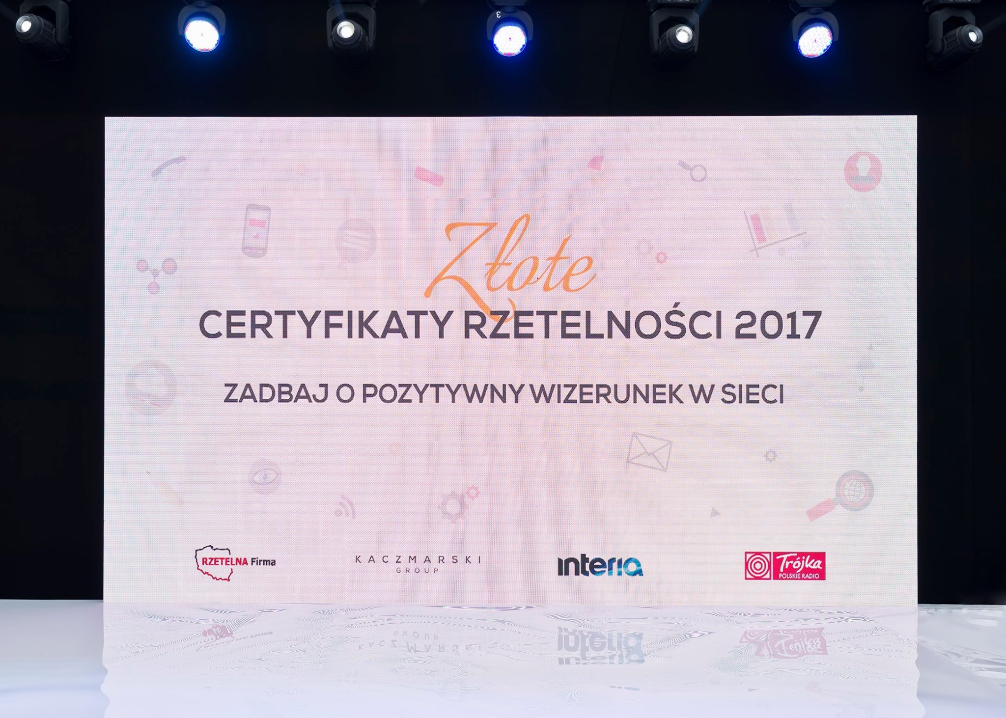 W 2017 roku wsparliśmy naszego klienta Rzetelną Firmę w organizacji eventu rozdania Złotych Certyfikatów Rzetelności. Gala firmy odbyła się w Warszawie w niesamowitej przestrzeni Fortu Sokolnickiego zwieńczonego kopułą. Certyfikat Rzetelności otrzymuje firma, która nie jest wpisana do Krajowego Rejestru Długów i nie zalega z żadnymi zobowiązaniami finansowymi.
